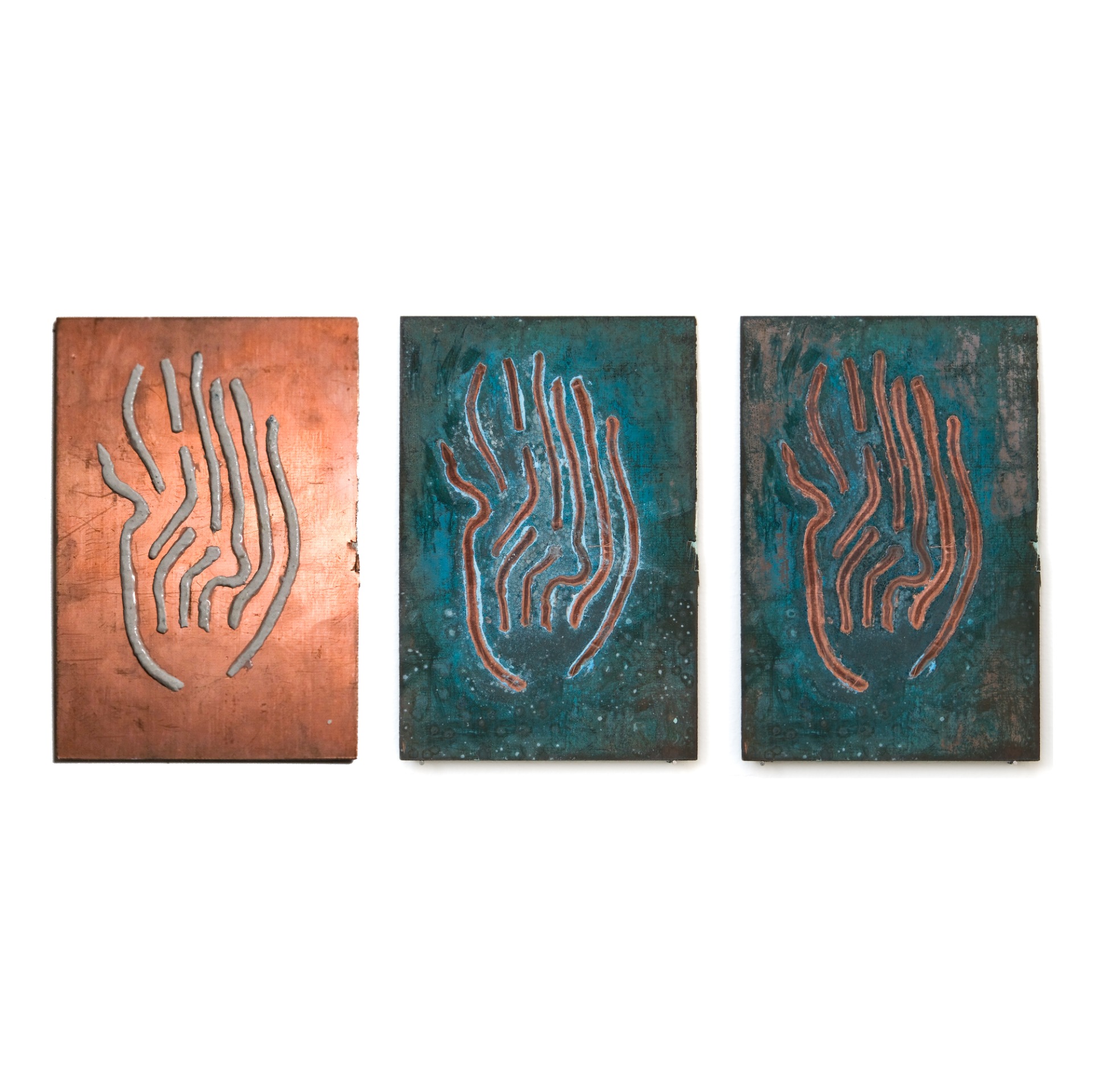 An over-wet clay eye was placed on copper and exposed to moisture, ammonia, and vinegar. The clay drew in the fumes and held them close: while the surrounding surface corroded, the sealed center resisted rusting.