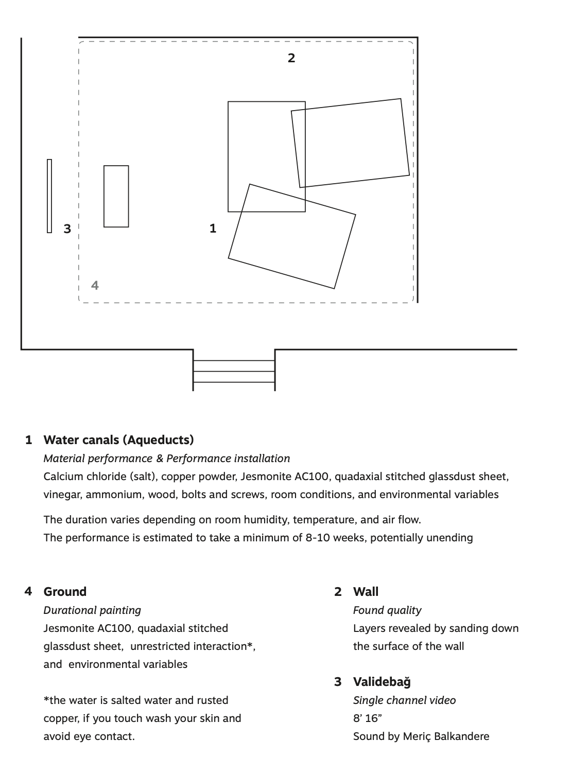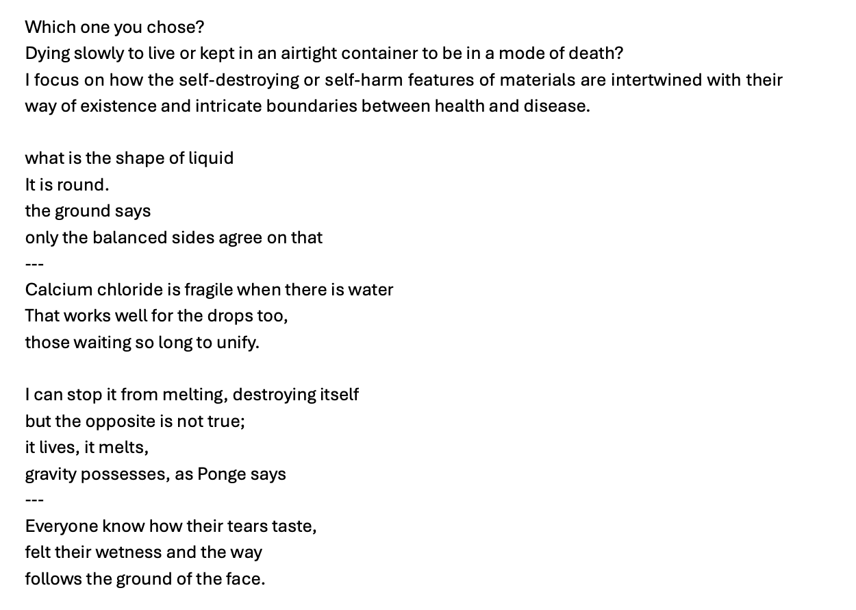 Calcium chloride (salt), copper powder, Jesmonite AC100, quadaxial stitched glassdust sheet, vinegar, ammonium, wood, bolts and screws, room conditions, and environmental variables