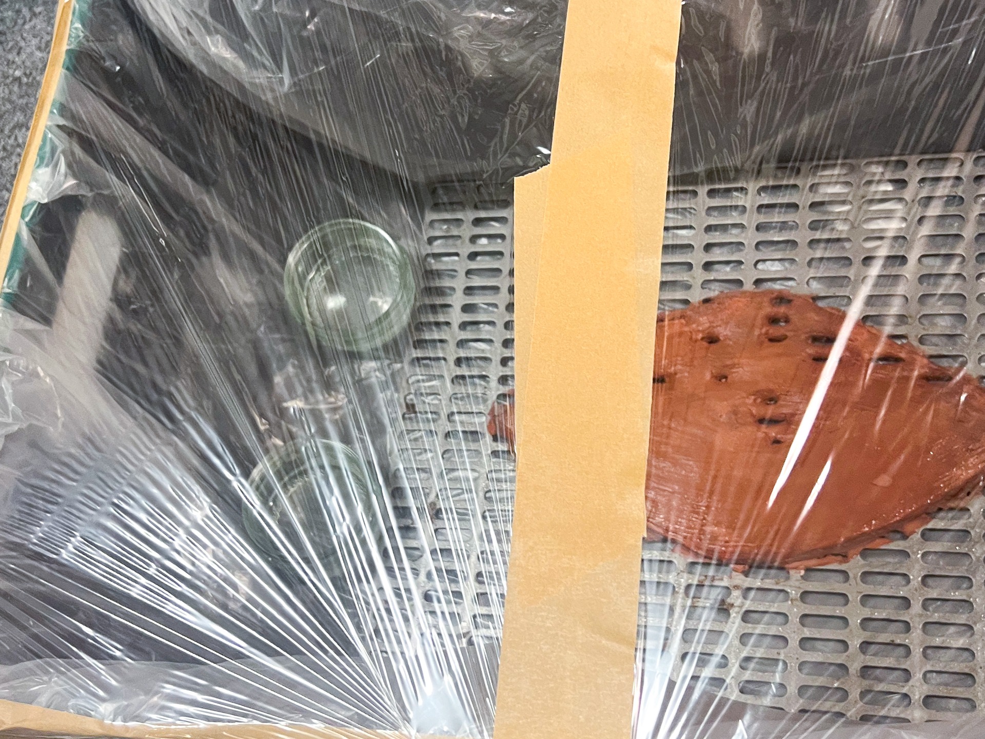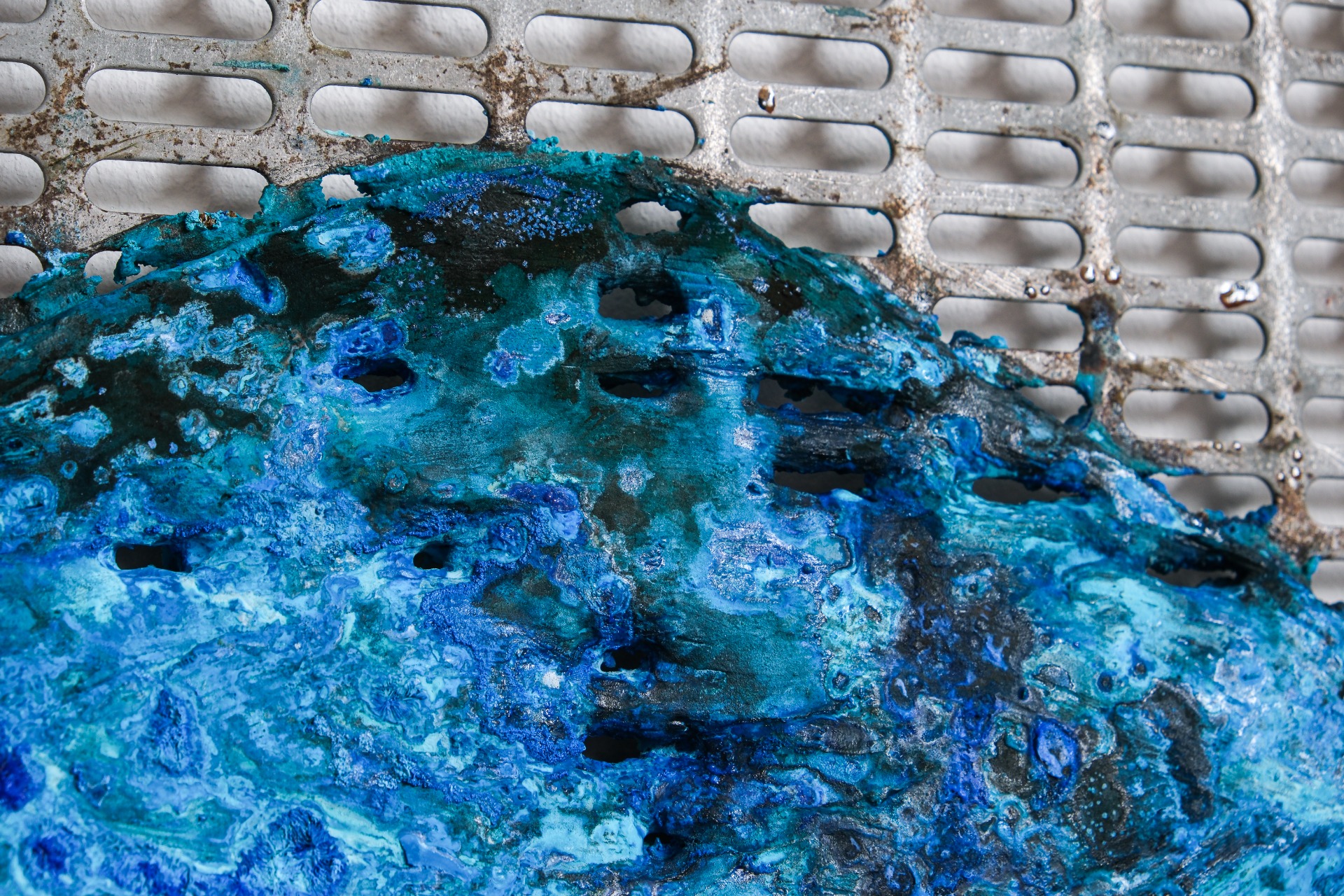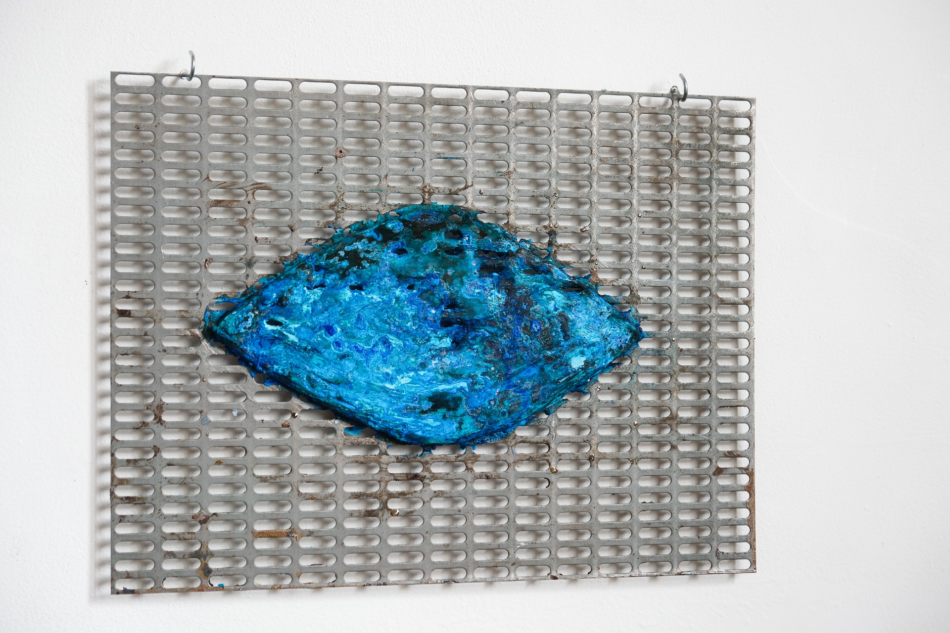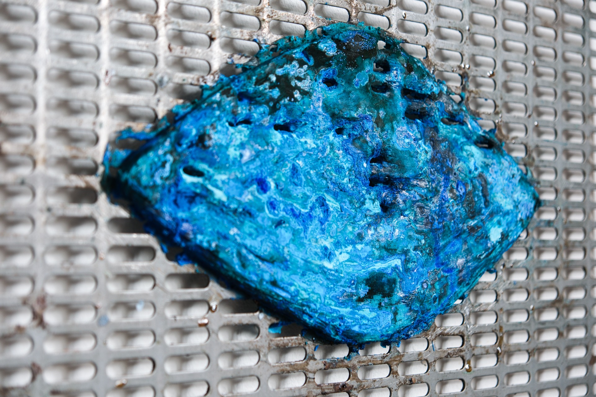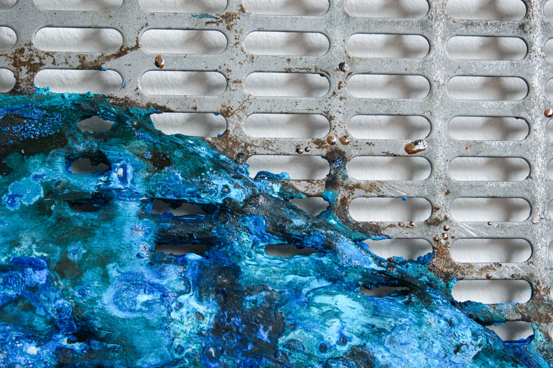 Through calcium chloride, vinegar, ammonium, and environmental exposure, the surface oxidises, shifts from copper to blue, and begins to produce liquid. This liquid stains and rusts the mesh itself, drawing the surrounding metal from grey towards copper tones. The work approaches the eye not only as an image, but as a small site of observation: held, watched, and still unfolding.