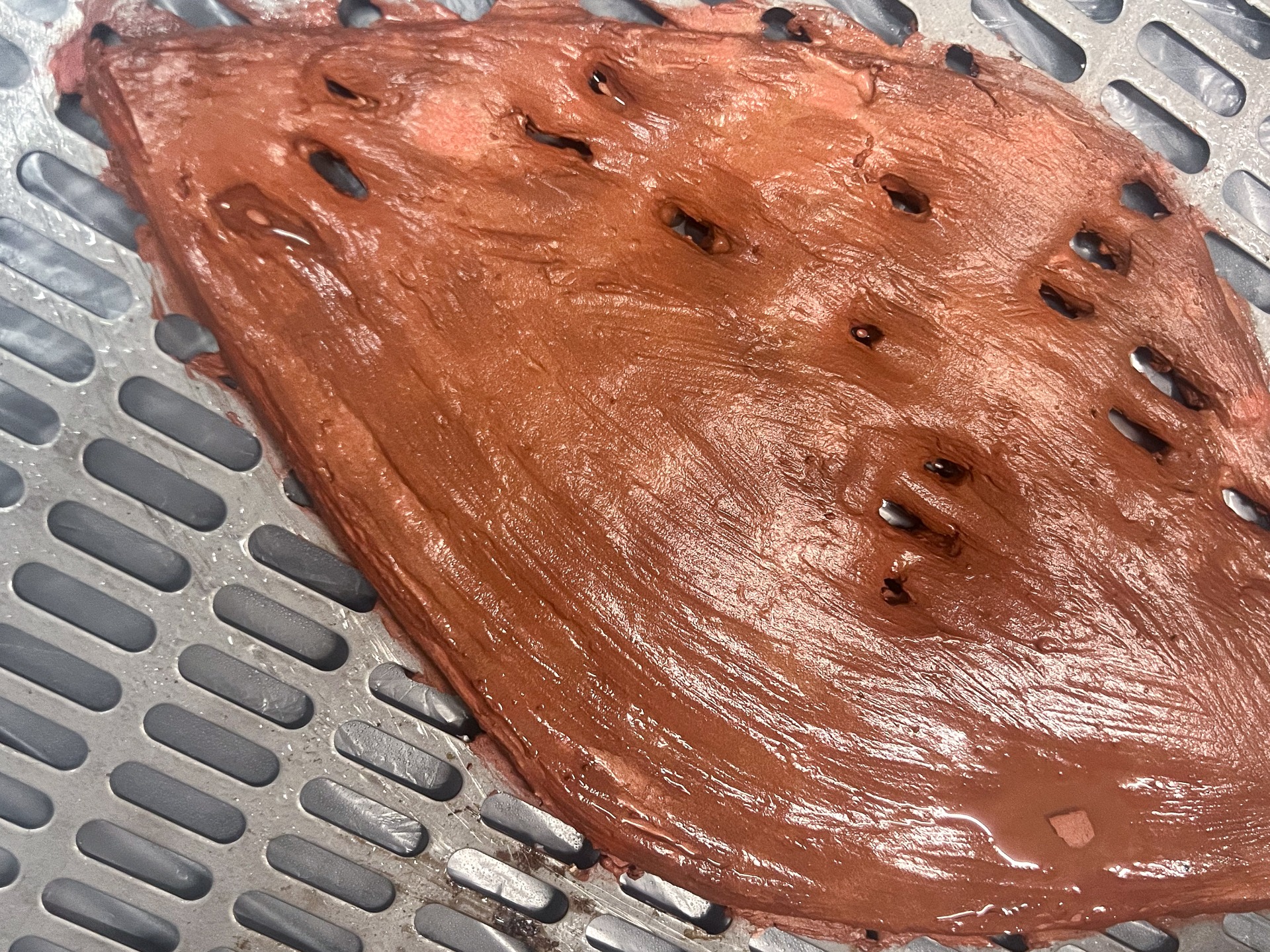 Copper dust mixed Jesmonite AC100, metal mesh, calcium chloride, ammonium, vinegar, environmental variables.