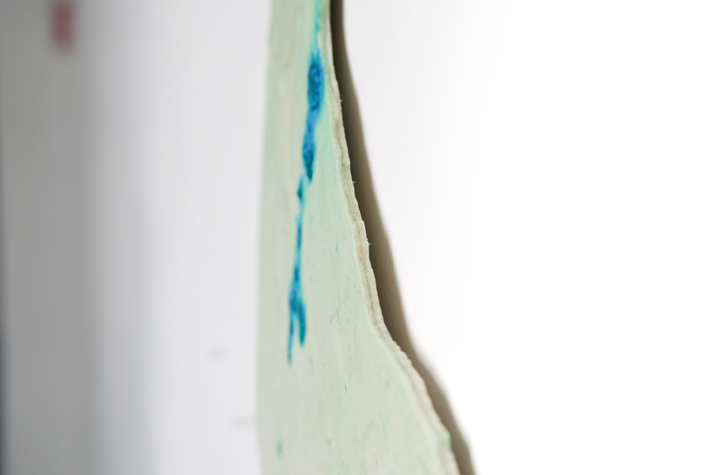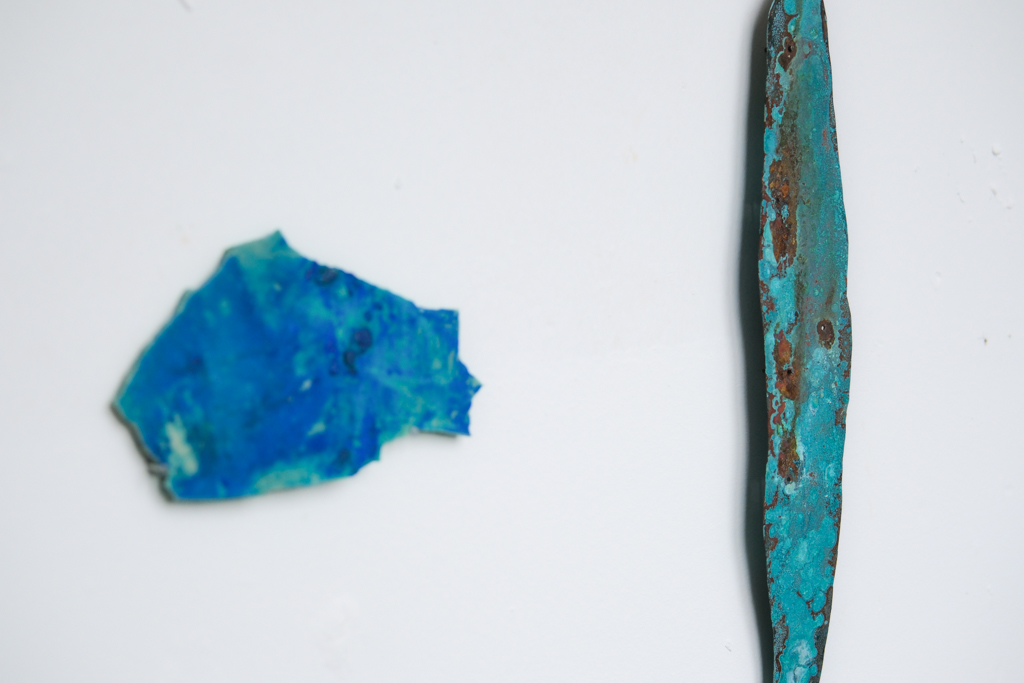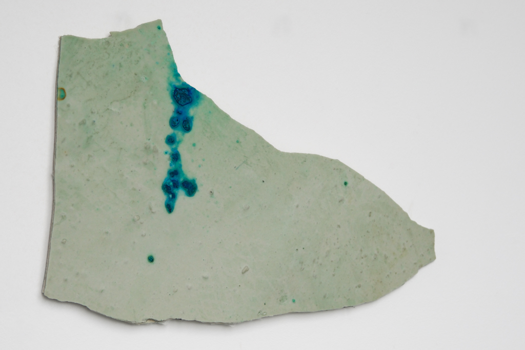 During the deinstallation of my MFA Degree Show, I had to break the floor to deinstall the trace collector piece, and I demolished it without a precise plan. I kept the pieces that were the strongest storytellers of the installation and the whole process of installing, exhibiting, and deinstalling. Since all traces contain calcium chloride, still humid, these fragments contaminate the exhibition's residues onto hands*, walls, and any surfaces. Ready to chemically transform each second, sensitive to room conditions, they continue to rust, dry, sweat, and carry the degree show beyond its end.