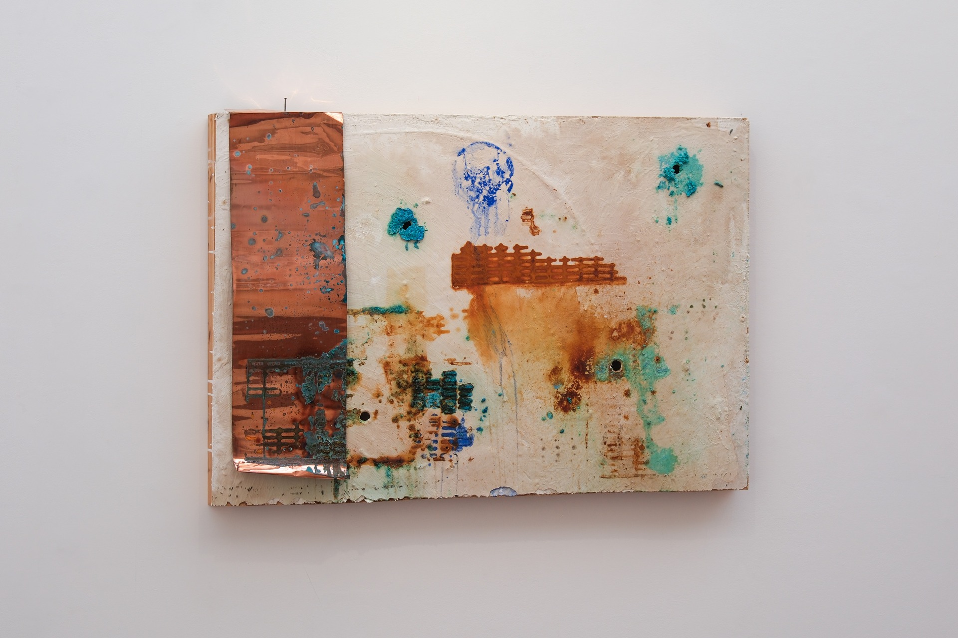 Panel I originated as a floor-based work and became the first in a series of panel studies centred on materials that continue to change and remain responsive to environmental conditions. The work brings together copper, calcium chloride, Jesmonite, and translucent surfaces to explore the contrast between the different scales of time and form at which materials, the human body, and the environment operate. Its surface acts as a site of accumulation, collecting traces of memory, change, decay, and observation like a fragile skin or archive. Rather than existing as a fixed image, the work develops through the ongoing cooperation between material and its outside, where absorption, reaction, and exposure continue to shape its form. In this way, Panel I holds stillness and momentum together, allowing an inner movement to remain present on the surface.