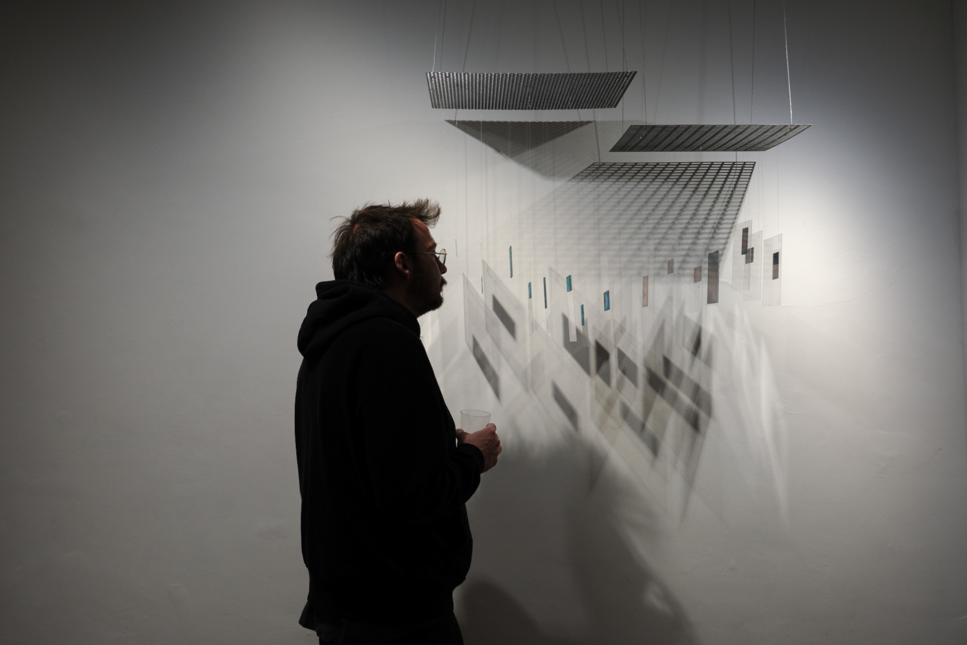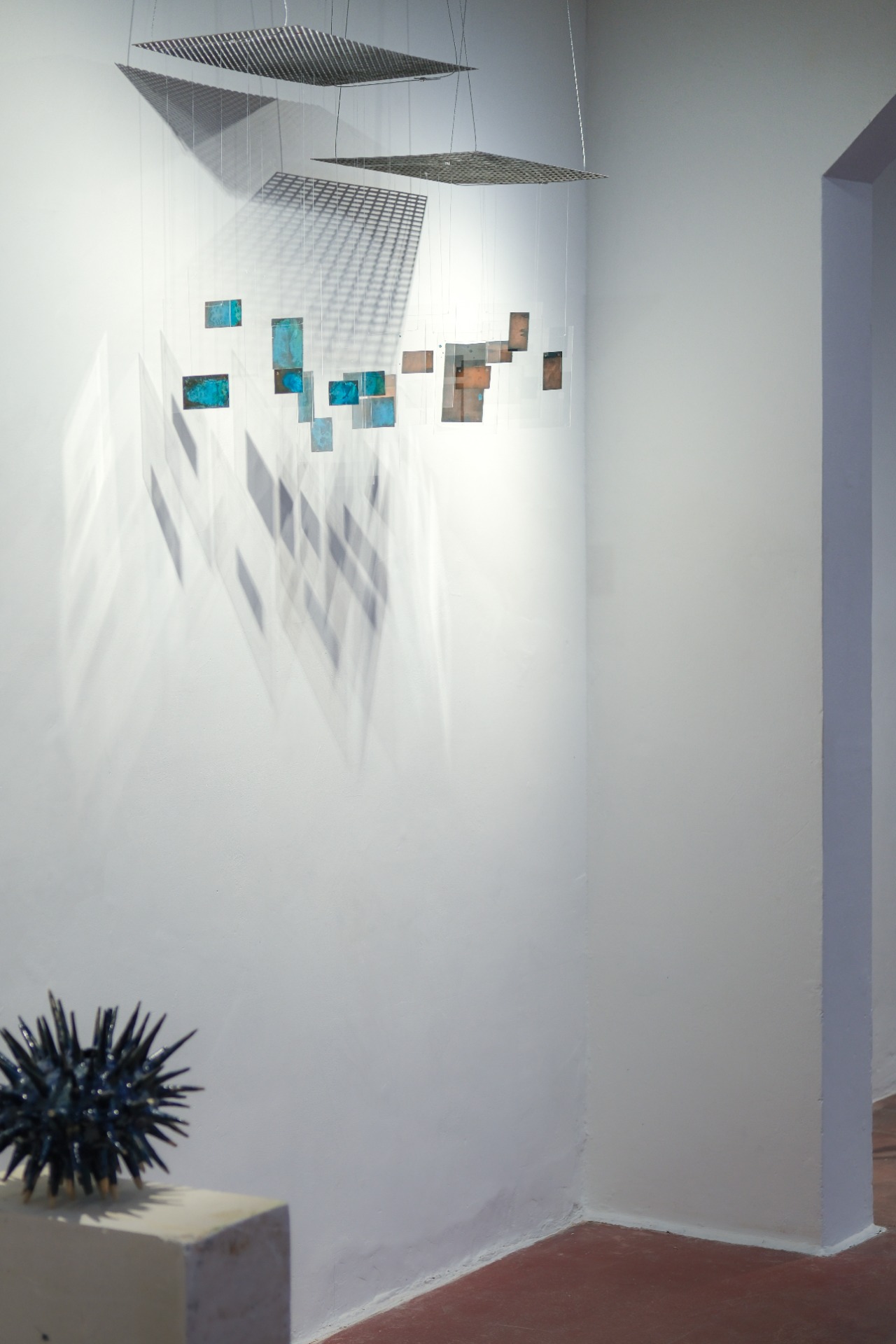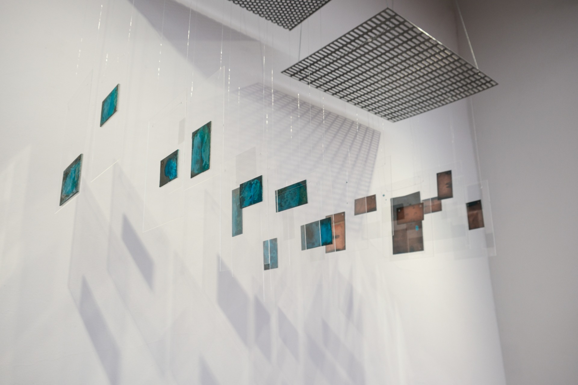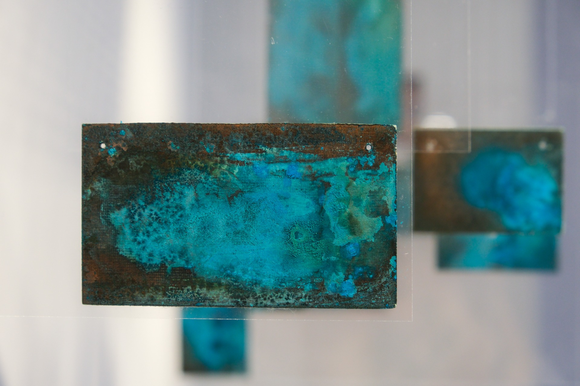 The work adopts the logic of specimen display. Copper plates, initially encountered as a bulk of found material, are gathered onto a single surface and reorganised within a new system. They are oxidised together through vinegar and ammonium fumes, then scratched, sanded, worn, and fumed again. In the final stage, individual fragments are selected from this larger system, isolated, and held between transparent planes, as though excised from a body and prepared for microscopic examination.